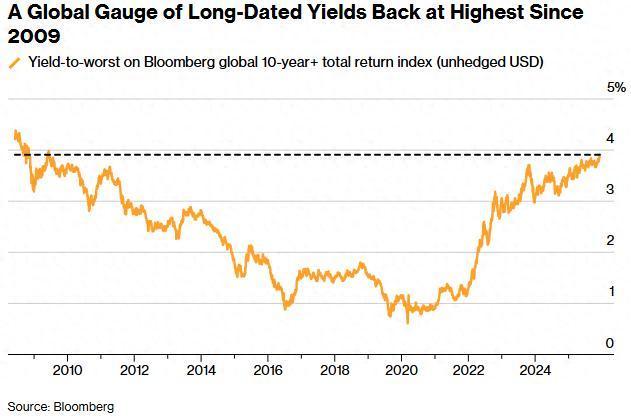 债券投资者正在从头扫视公共增长出路,扫视特朗普总统生意战中的通胀风险,以及从日本到英国列国政府债务飙升的影响。日本、英国和德国的债券收益率也已攀升至多年高位,其中长久债券靠近最大压力,因为投资者条件更高赔偿以握有风险更高的证券。